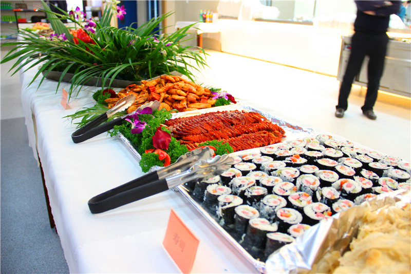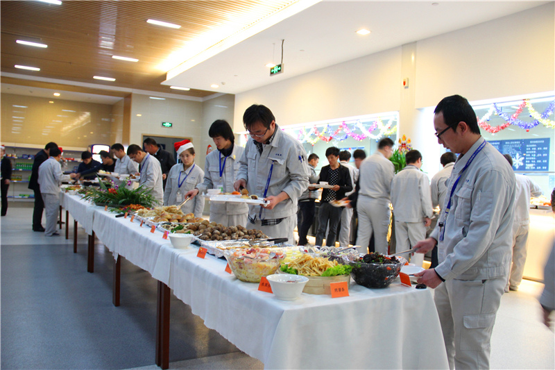 点餐的窗口改造成了自助取餐的餐台。员工餐厅一改以往工作套餐的形式,配合行政办公室推出了圣诞节自助餐。除提供美味可口的中式菜肴外,还有京味点心,西式糕点,日式寿司,韩式炸鸡,意式面点,水果沙拉、蔬菜沙拉等,所有食物供员工自由选择,且所有食物均无限量供应。