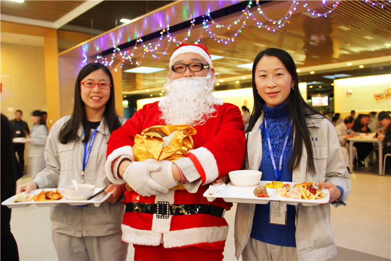 12月25日中午,行政办公室将员工餐厅精心布置了一番。餐厅里挂满了闪亮的灯,墙壁上也应景的贴上了圣诞快乐的祝福语,电视上播着世界各地欢庆圣诞节的幸福画面,耳边回荡着充满节日氛围的欢快音乐。